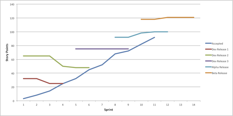 You can eyeball an extension of the line of accepted stories to see that the current goals look pretty reasonable. As of sprint 11, it looks good to meet the expectations for the alpha release and almost certain to meet the expectations for the beta release. Nothing is a sure thing, of course. With a simple burnup chart we can monitor progress all the way to the last release, prepared to modify our plan if needed.